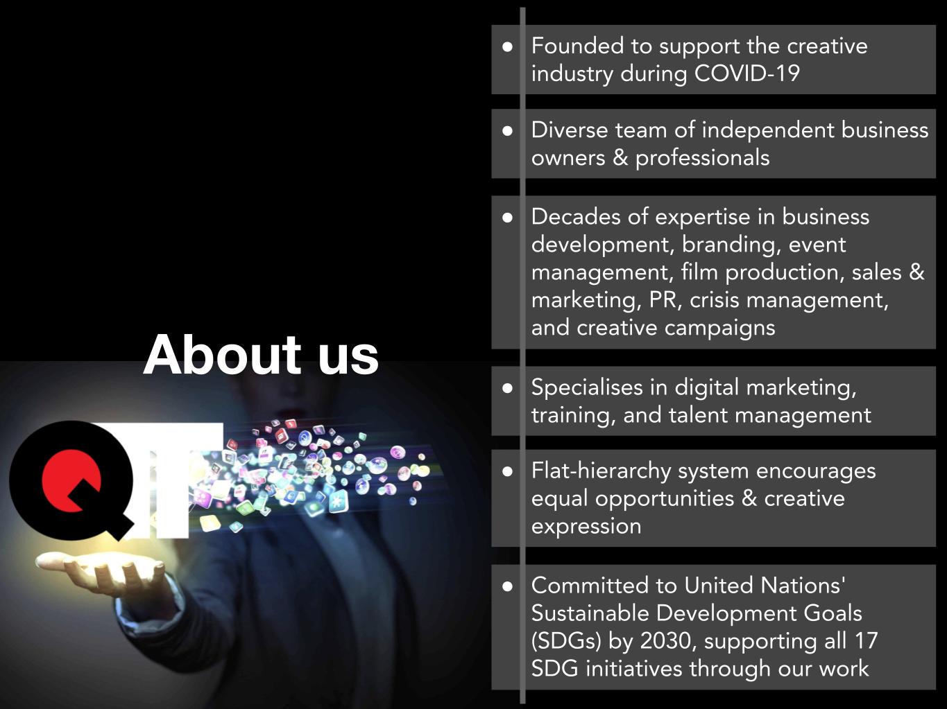 QTT Group was founded with a deep commitment to supporting our friends and colleagues in the creative industry, particularly during the challenging times of the COVID-19 pandemic. By bringing together a diverse group of independent business owners and professionals, each with decades of experience, we have formed a powerhouse of talent and innovation.
