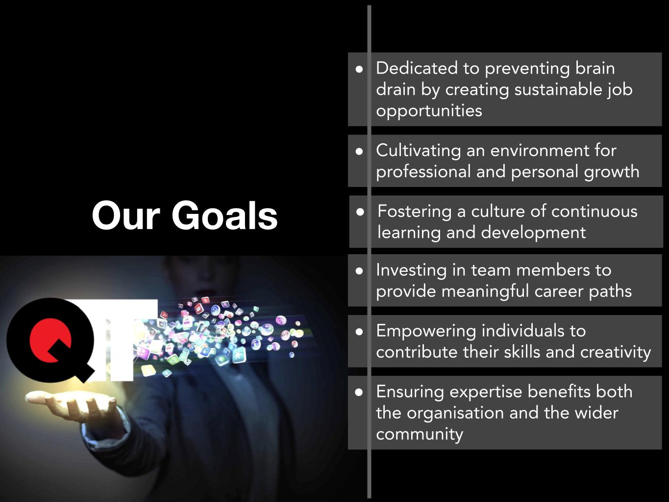 At QTT Group, we are dedicated to preventing brain drain by creating sustainable job opportunities that retain and nurture talent. We strive to cultivate an environment where individuals can grow professionally and personally, fostering a culture of continuous learning and development.